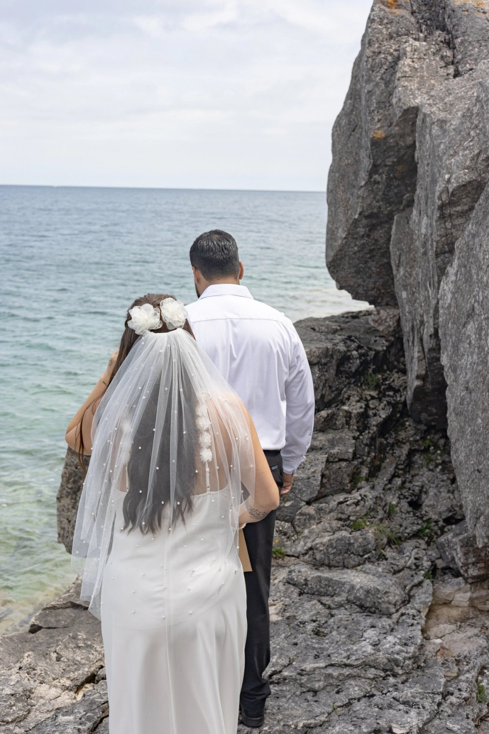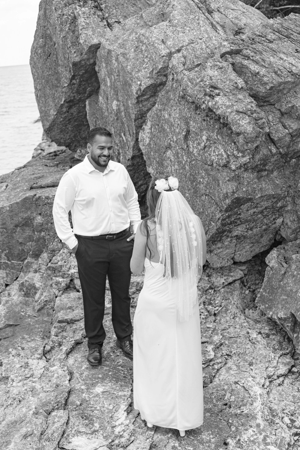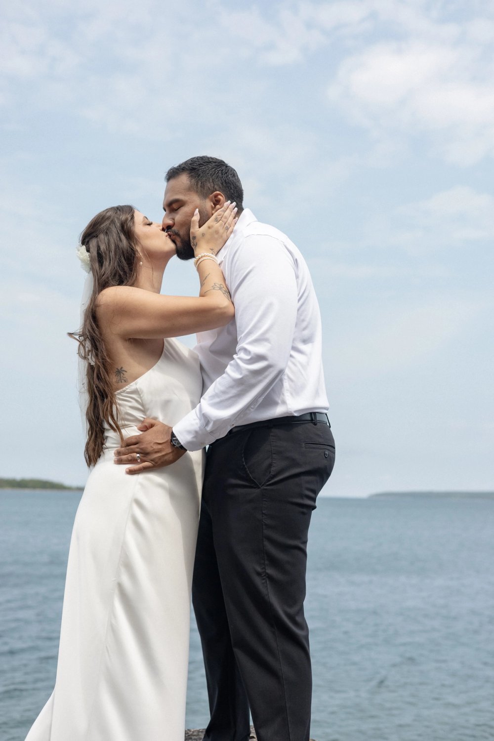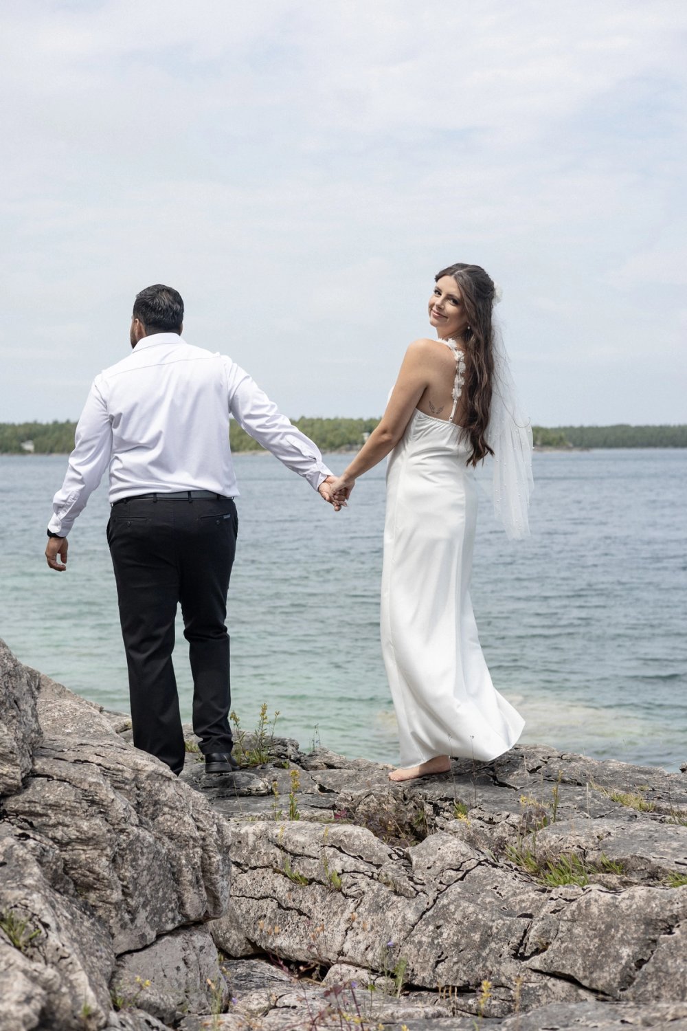 They exchanged heartfelt vows on a stunning rocky lookout, overlooking Georgian Bay. With the water shimmering in vibrant shades of turquoise and blue beneath them, the scene was naturally breathtaking, needing no decoration beyond their presence. As a documentary-style photographer, it was an honour to document such pure, authentic moments, unposed and deeply meaningful.